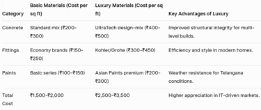 Comparison Table: Material and Cost Analysis for Construction in Puppalaguda and Alkapur